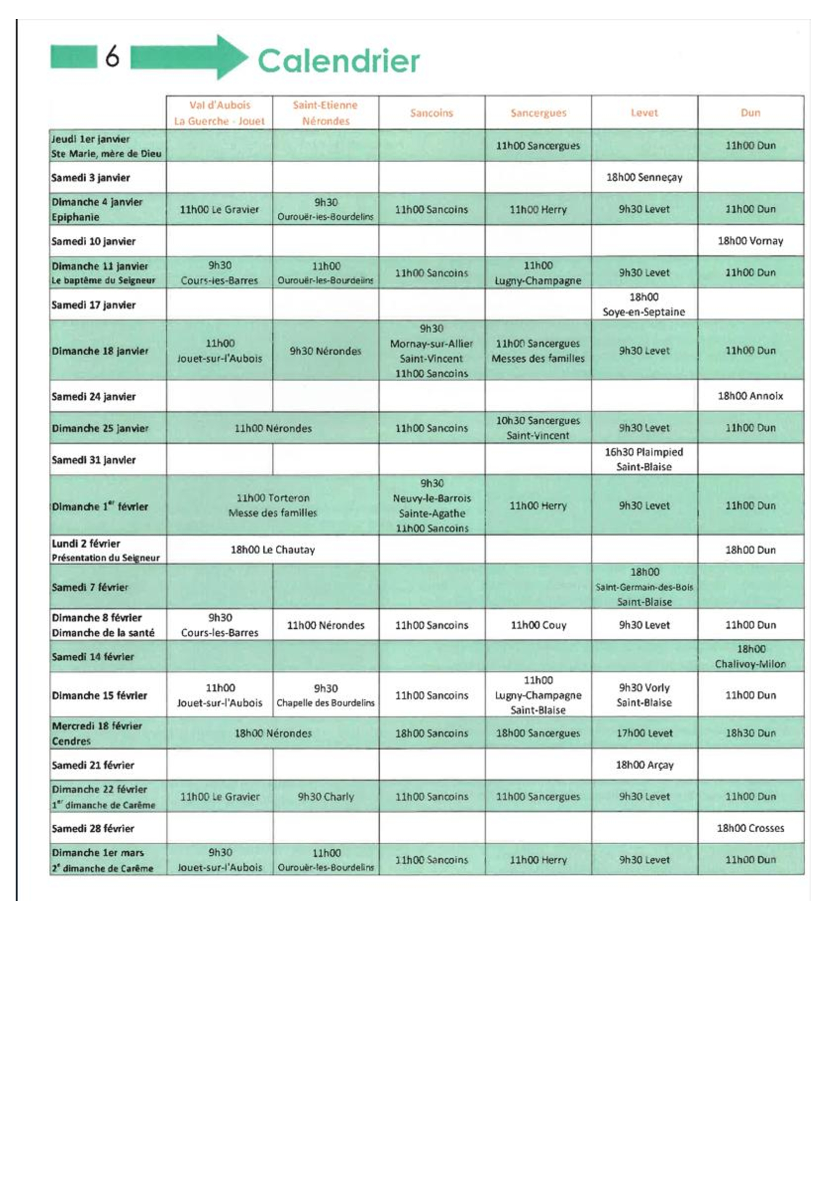 Calendrier des messes